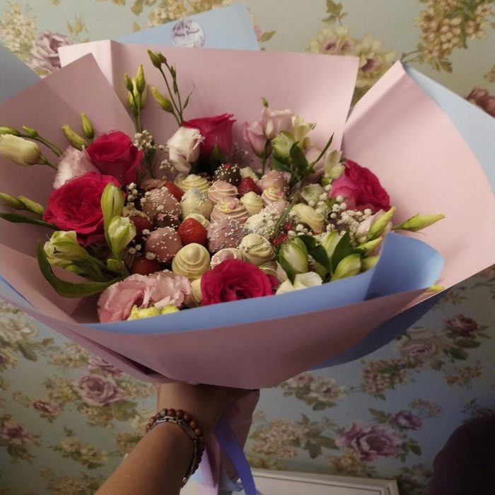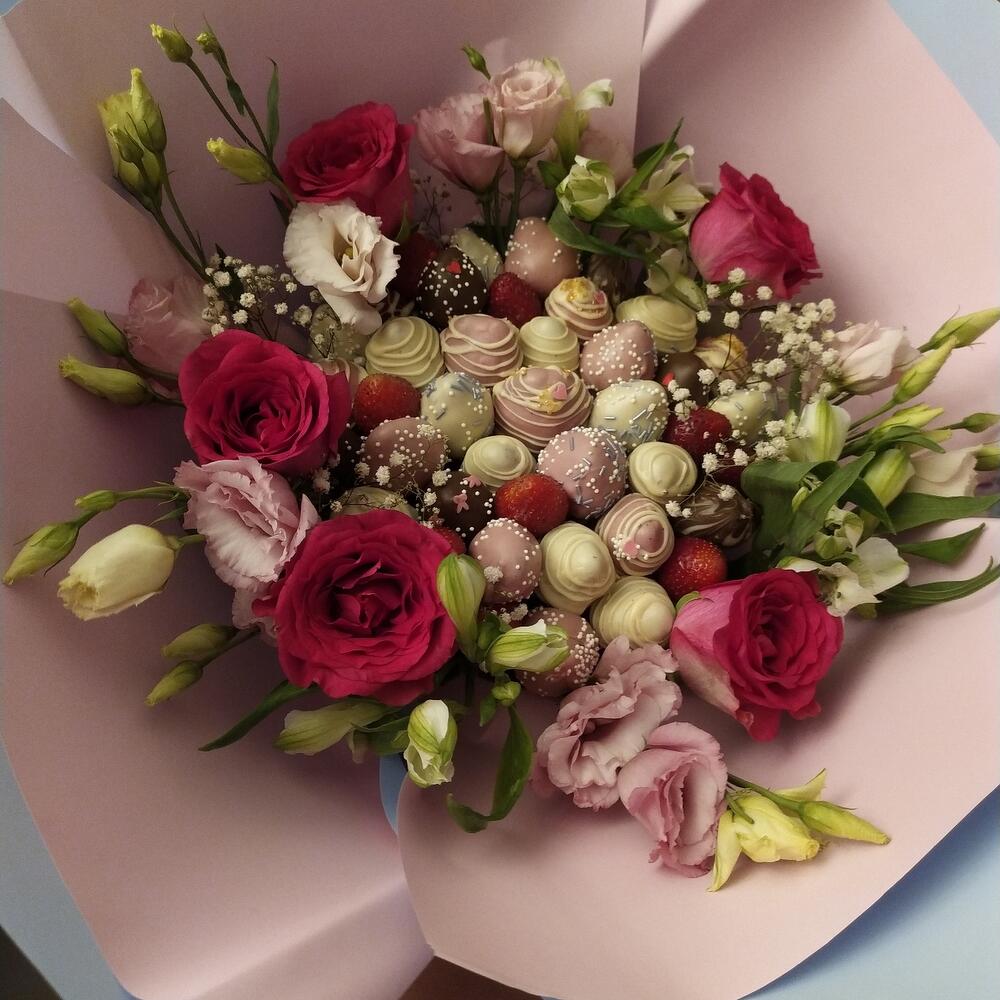 Альстромерия – 3 шт.Клубника – 8 шт.Лизиантус – 6 шт.Клубника в шоколаде callebaut (бельгия) – 30 шт.Дизайнерская упаковка – 1 шт.розы алые 60 см – 5 шт.