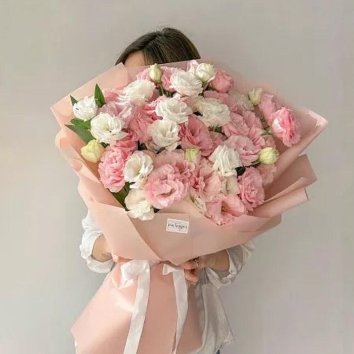 Букет из лизиантуса, хлопка и диантуса