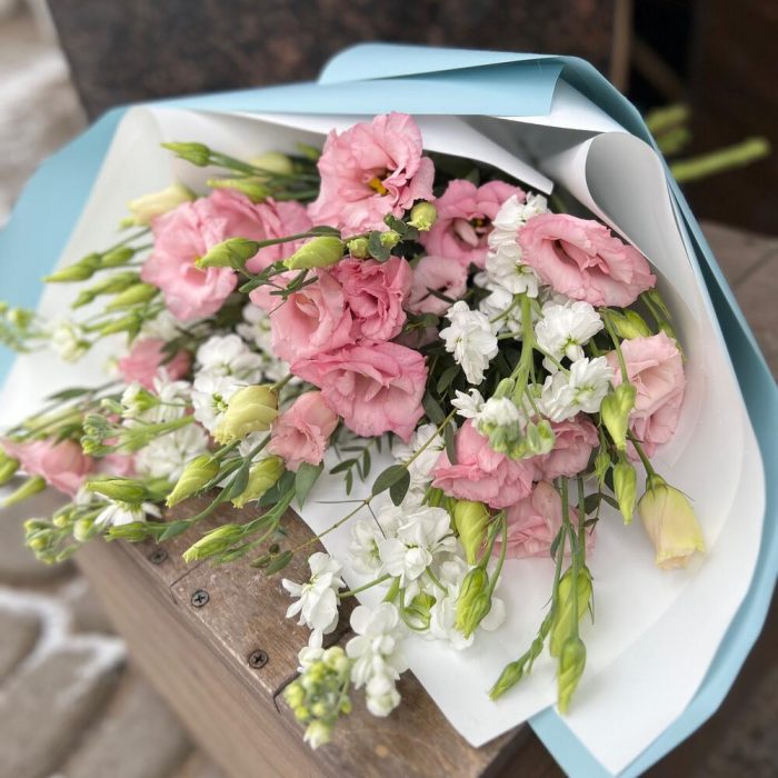 Маттиола белая – 5 шт.Упаковка дизайнерская – 4 шт.Лента атласная – 1 шт.Лизиантус – 5 шт.Эвкалипт Парвифолио – 1 шт.