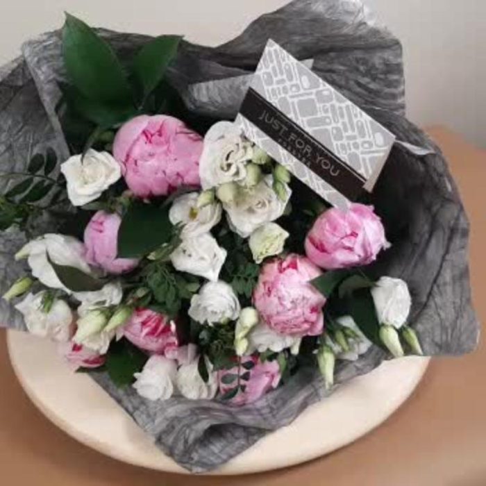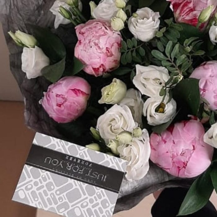 Пион Сара Бернар – 7 шт.эустома белая – 7 шт.Писташ – 5 шт.