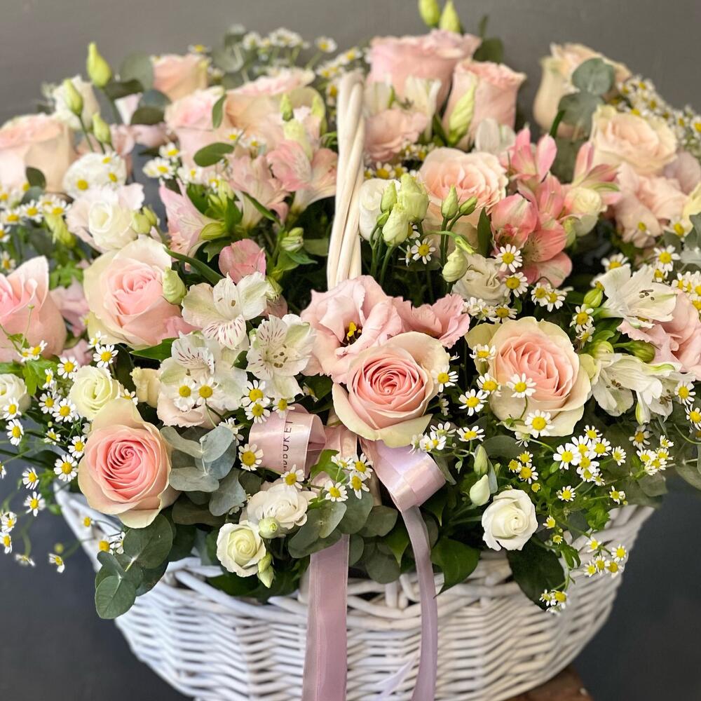 Альстромерия – 11 шт.Эвкалипт – 11 шт.Эустома – 7 шт.Лента атласная – 1 шт.Корзина плетеная – 1 шт.Оазис флористический – 3 шт.пленка транспортировочная – 1 шт.ромашки кустовые – 9 шт.розовые розы – 11 шт.