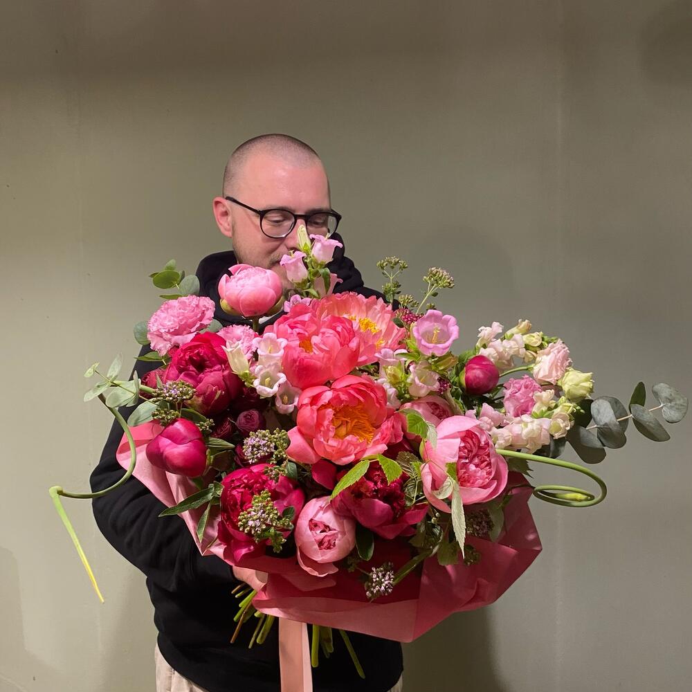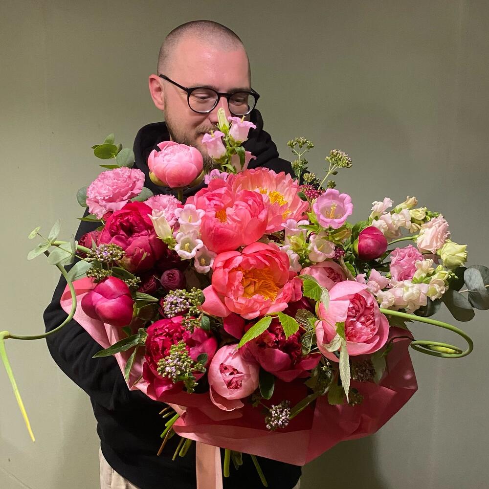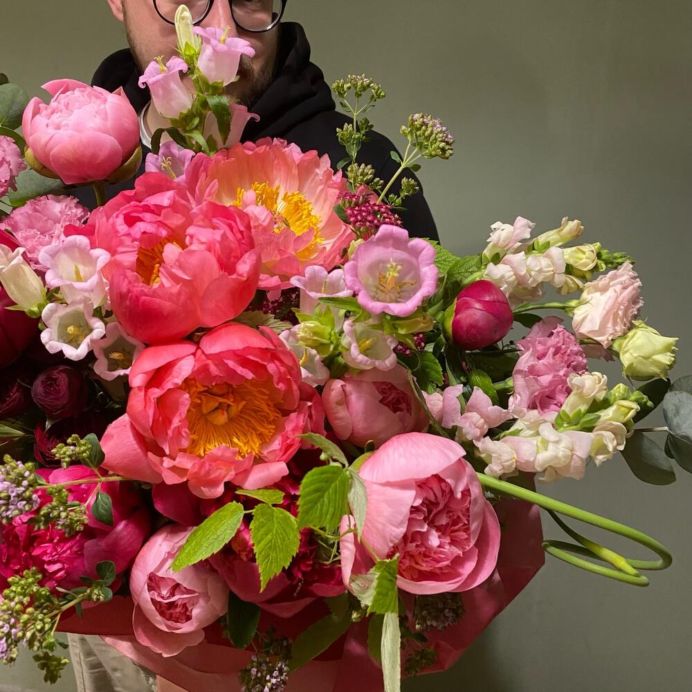 Лизиантус – 3 шт.Пион – 13 шт.Эвкалипт – 5 шт.Упаковка – 1 шт.Малина – 3 шт.Львиный зев – 3 шт.Травы – 7 шт.Колокольчик – 2 шт.