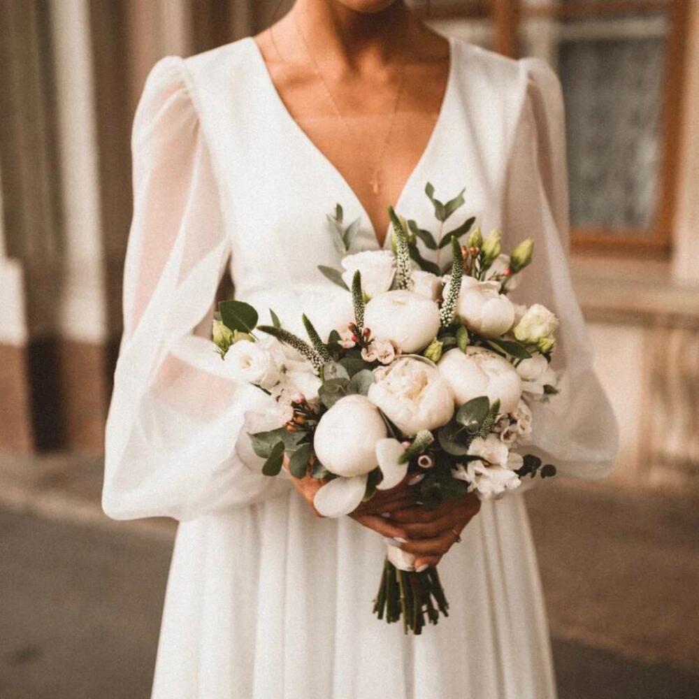 пионы – 9 шт.Ваксфлауэр белый – 2 шт.Вероника – 5 шт.Лента атласная – 5 шт.Лизиантус Алиса белый – 2 шт.Эвкалипт Baby Blue – 1 шт.