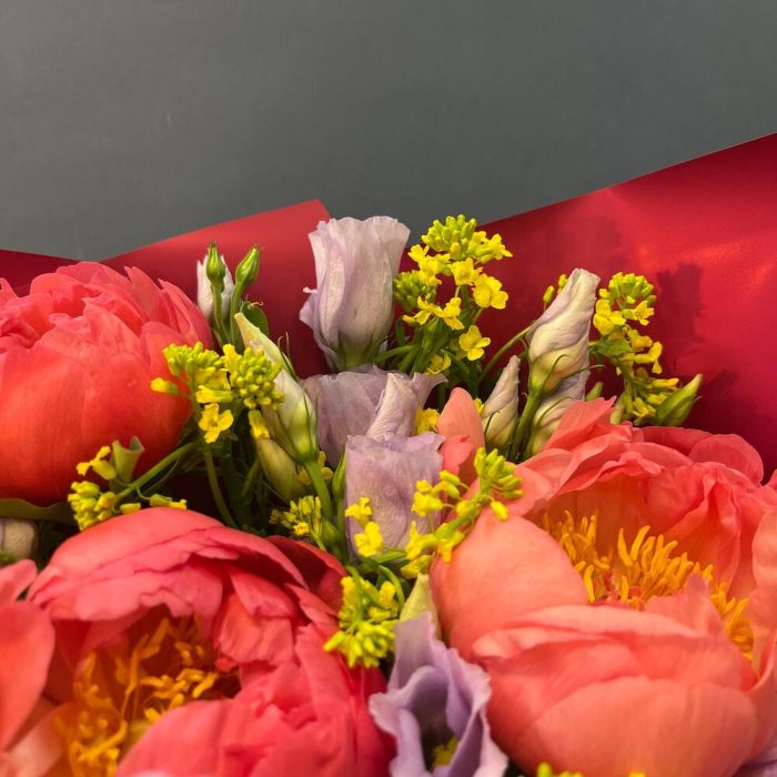Лизиантус лавандовый – 4 шт.Упаковка корейская пленка – 1 шт.лента атласная салатовая – 1 шт.экзотика зелень желтая – 8 шт.пион премиум Коралл шарм – 3 шт.