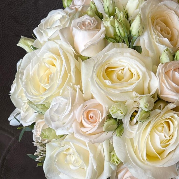 розы кремовые россия – 11 шт.Эустома – 5 шт.кремовые кустовые розы – 7 шт.Эвкалипт Микс – 11 шт.Лента белая атласная – 1 шт.Булавка с бусами – 6 шт.работа флориста – 1 шт.