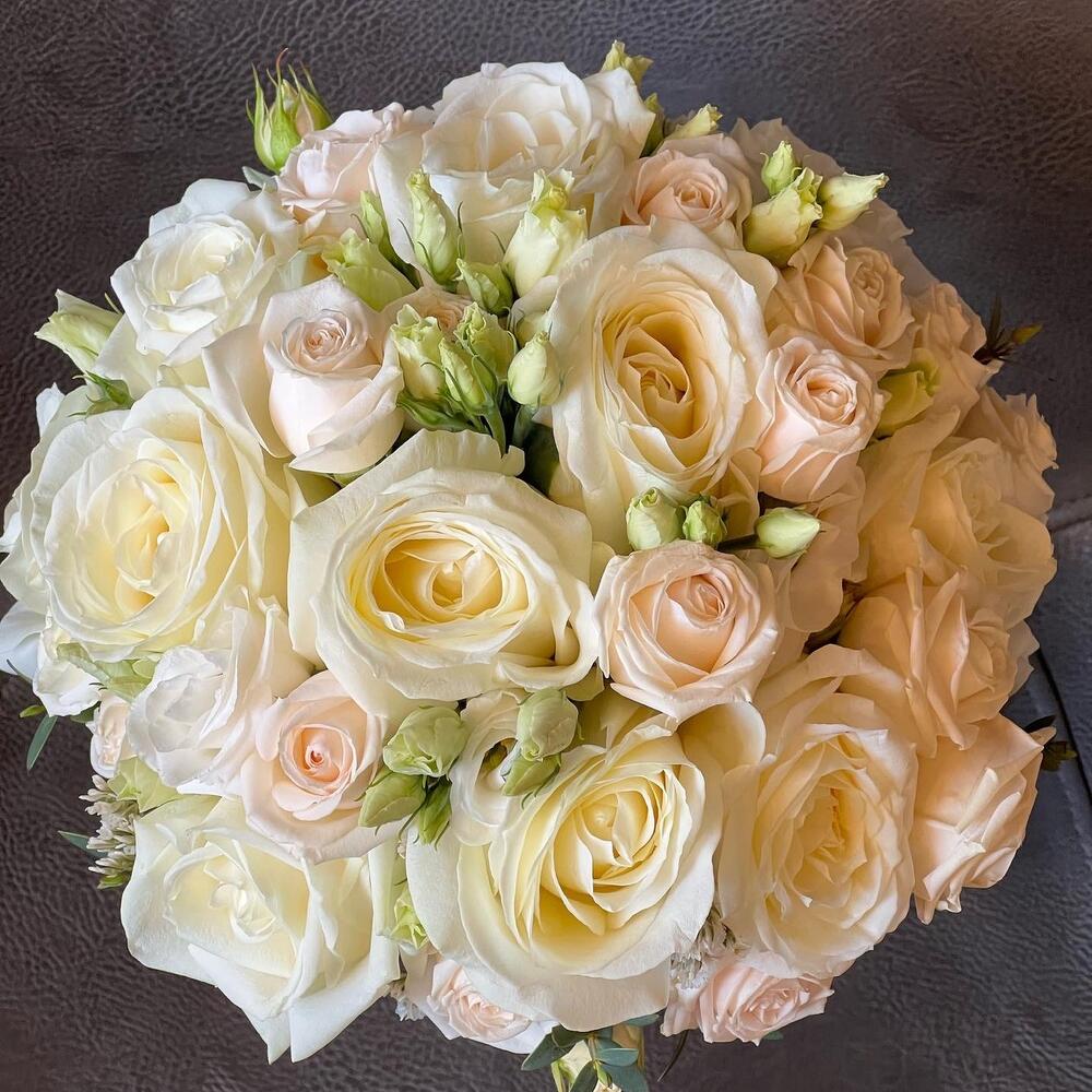 Стильный букет в кремовой гамме в классическом составе. Состав может быть скорректирован с учётом сезонности цветов на дату заказа. Цветовая гамма не меняется , могут быть равнозначные замены.Мы бережно и вовремя доставляем букеты в дату торжества и накануне.