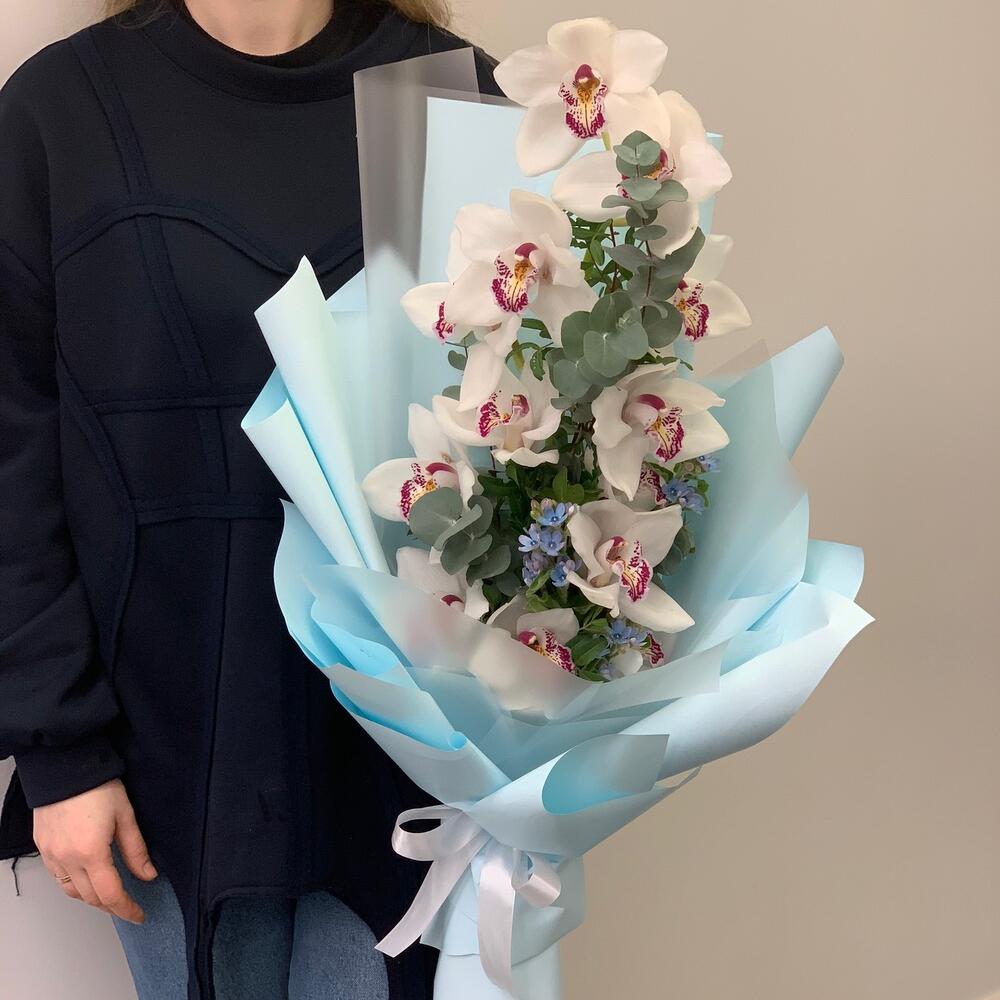орхидея – 1 шт.Твидия – 3 шт.Дизайнерская упаковка – 3 шт.Эвкалипт – 1 шт.Зелень – 2 шт.