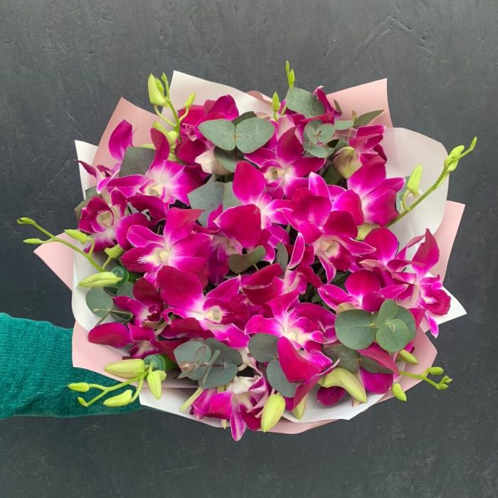 Дендробиум – 51 шт.удлинитель для орхидеи – 25 шт.Фисташка – 15 шт.Эвкалипт – 9 шт.Упаковка дизайнерская – 2 шт.Лента атласная – 1 шт.