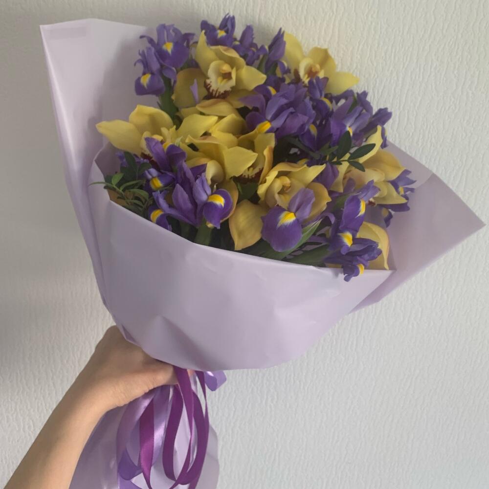 Ирис – 18 шт.Орхидея Цимбидиум – 9 шт.Фисташка – 3 шт.Упаковка дизайнерская – 1 шт.удлинитель для орхидеи – 9 шт.подкормка для срезанных цветов – 1 шт.переноска для цветов – 1 шт.