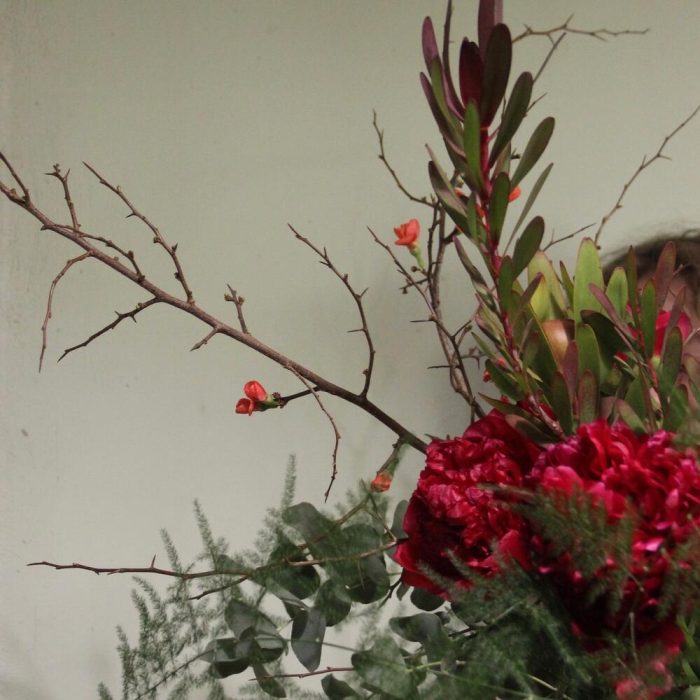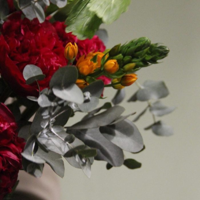 Алый – букет с пионами и ветвями