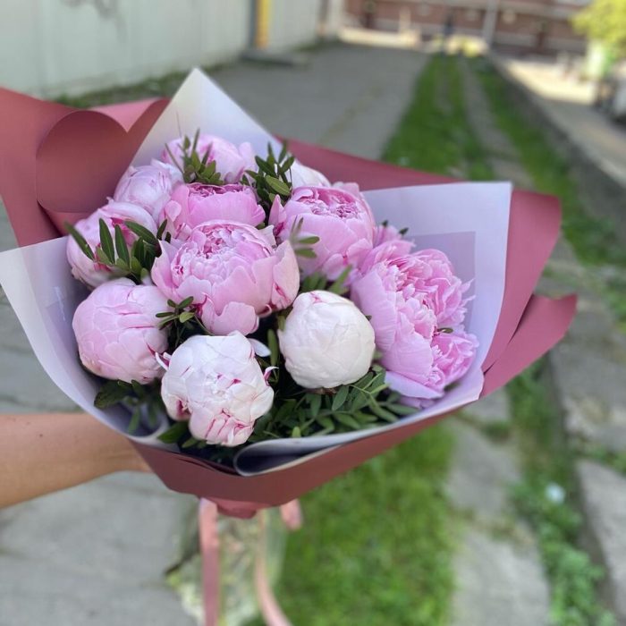 Пион – 11 шт.Писташ – 3 шт.Лента атласная – 1 шт.Упаковка дизайнерская – 3 шт.