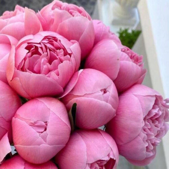 Пион розовый – 19 шт.Лента атласная – 2 шт.Открыточка с вашими пожеланиями – 1 шт.хорошее настроение – 100 шт.инструкция по уходу за цветами – 1 шт.коробка переноска – 1 шт.Кризал – 1 шт.