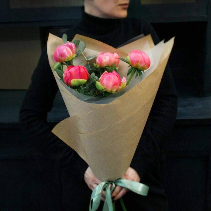 Пион Коралл Шарм (Coral Charm) – 5 шт.Эвкалипт – 2 шт.Дизайнерская упаковка – 1 шт.