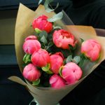 Букет из 9 коралловых пионов с эвкалиптом