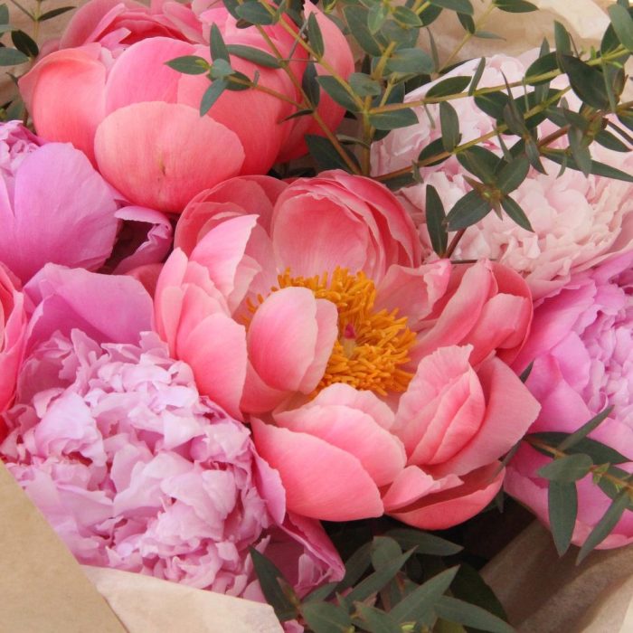 Лента – 1 шт.Пион – 7 шт.Эвкалипт – 3 шт.Тишью – 1 шт.Упаковка крафт – 2 шт.