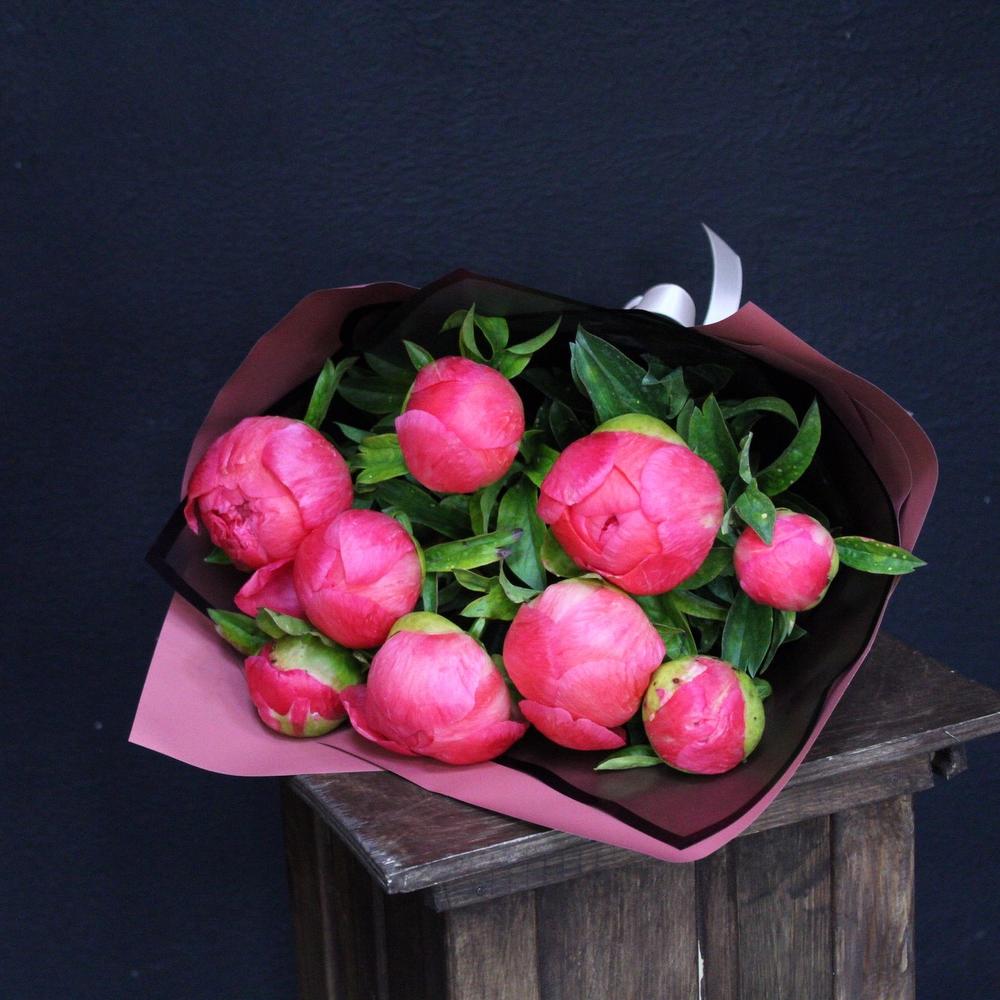 Лента атласная – 2 шт.Пленка дизайнерская – 3 шт.пион coral charm – 9 шт.
