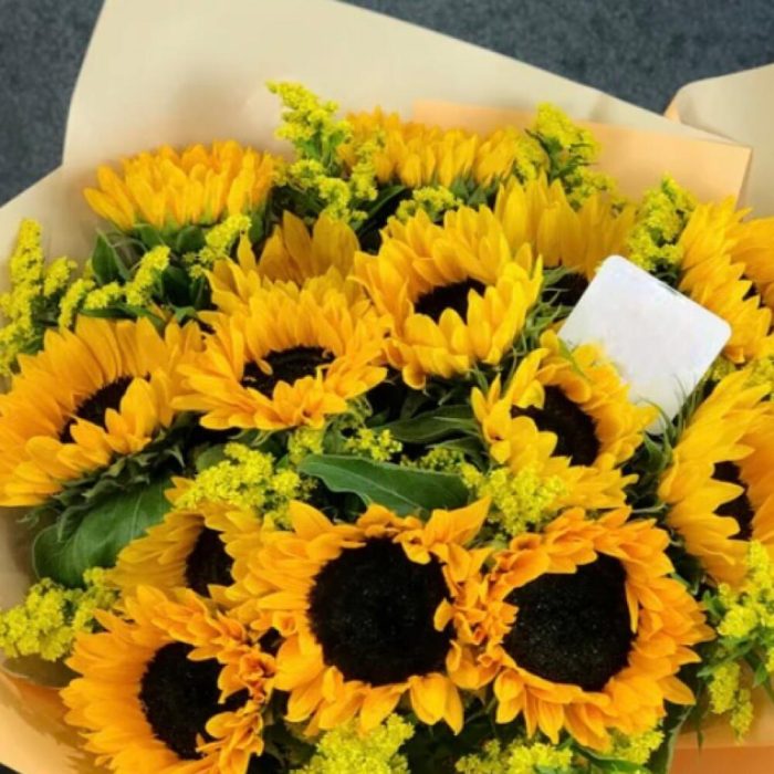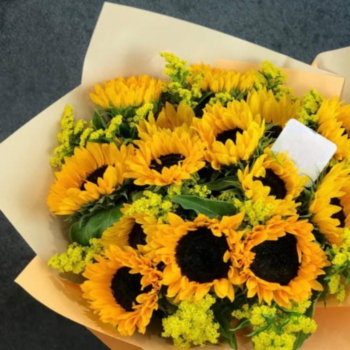 Подсолнух – 15 шт.Упаковка дизайнерская – 1 шт.Лента атласная – 1 шт.Открытка – 1 шт.инструкция по уходу за цветами – 1 шт.хорошее настроение – 1 шт.Кризал – 1 шт.коробка переноска – 1 шт.Мимоза – 10 шт.