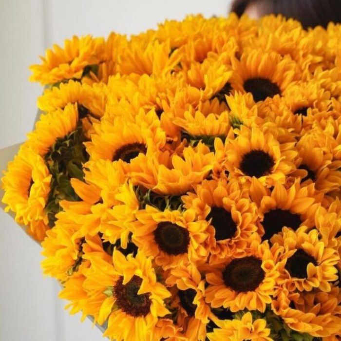 Подсолнух – 101 шт.Упаковка дизайнерская – 2 шт.Лента атласная – 2 шт.Открыточка с вашими пожеланиями – 1 шт.хорошее настроение – 100 шт.инструкция по уходу за цветами – 1 шт.коробка переноска – 1 шт.Кризал – 1 шт.