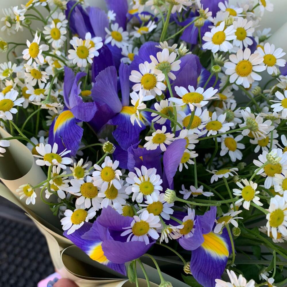 Букет с ромашками и ирисами