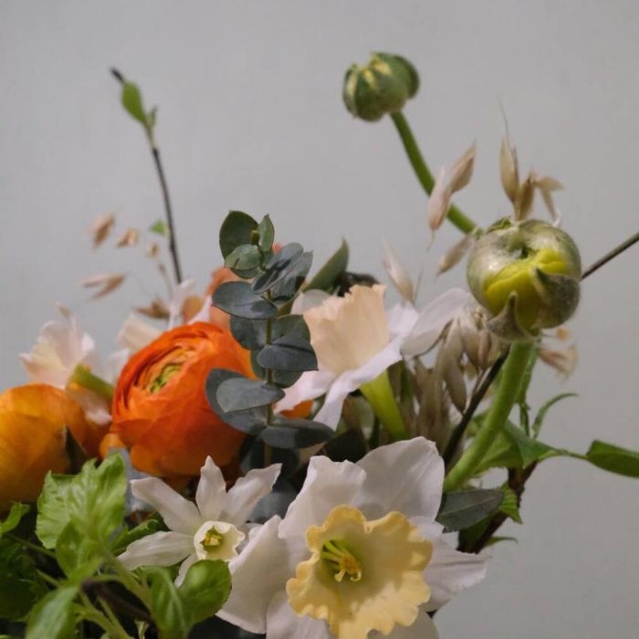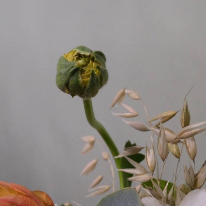 Ранункулюс – 3 шт.Ромашка – 3 шт.Нарцисс – 2 шт.Ветка – 3 шт.Овес – 5 шт.Керамическое кашпо – 1 шт.