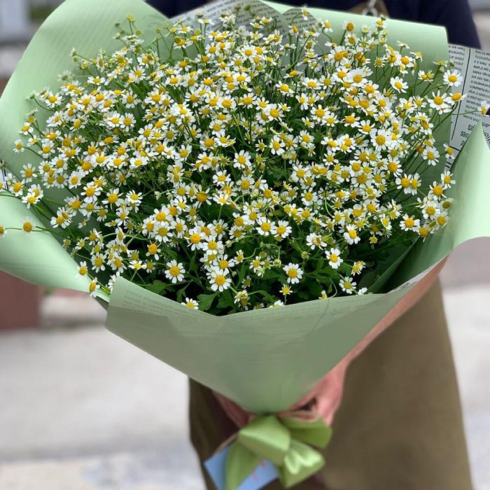 Матрикария (Ромашка Камила) – 19 шт.Упаковка дизайнерская – 1 шт.Лента атласная – 1 шт.