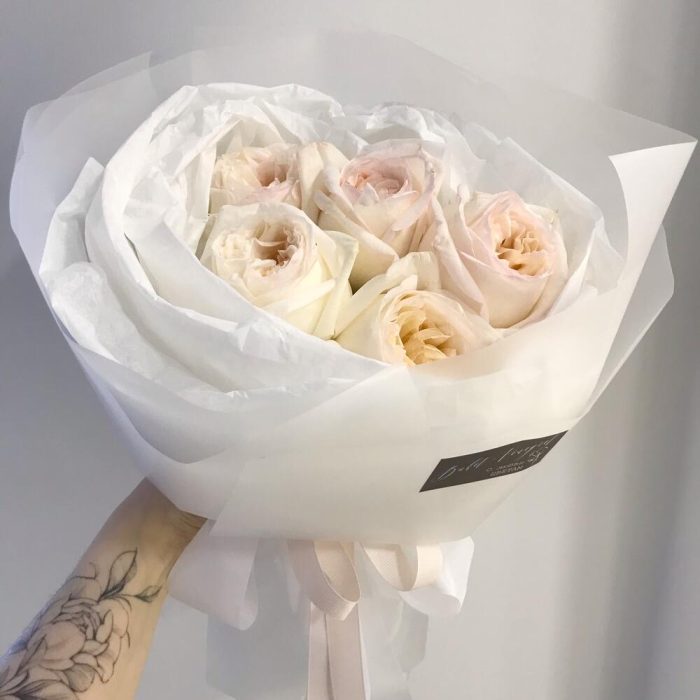 Лента атласная – 2 шт.Тишью – 3 шт.Аквабокс – 1 шт.Средство для продления жизни цветов – 1 шт.Карточка для подписи – 1 шт.Матовая упаковка – 2 шт.роза пионовидная вайт o’hara ароматная – 5 шт.чек лист по уходу за цветами – 1 шт.