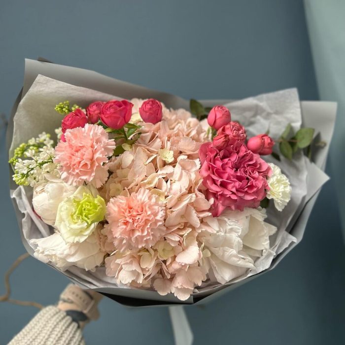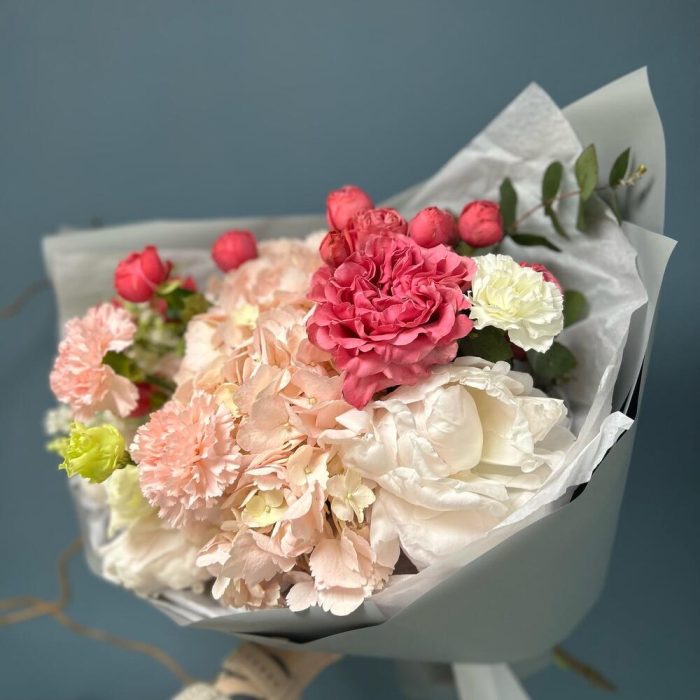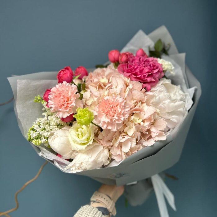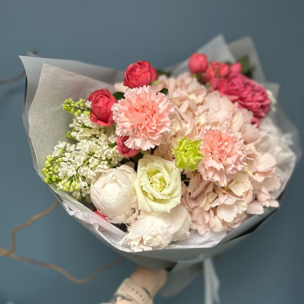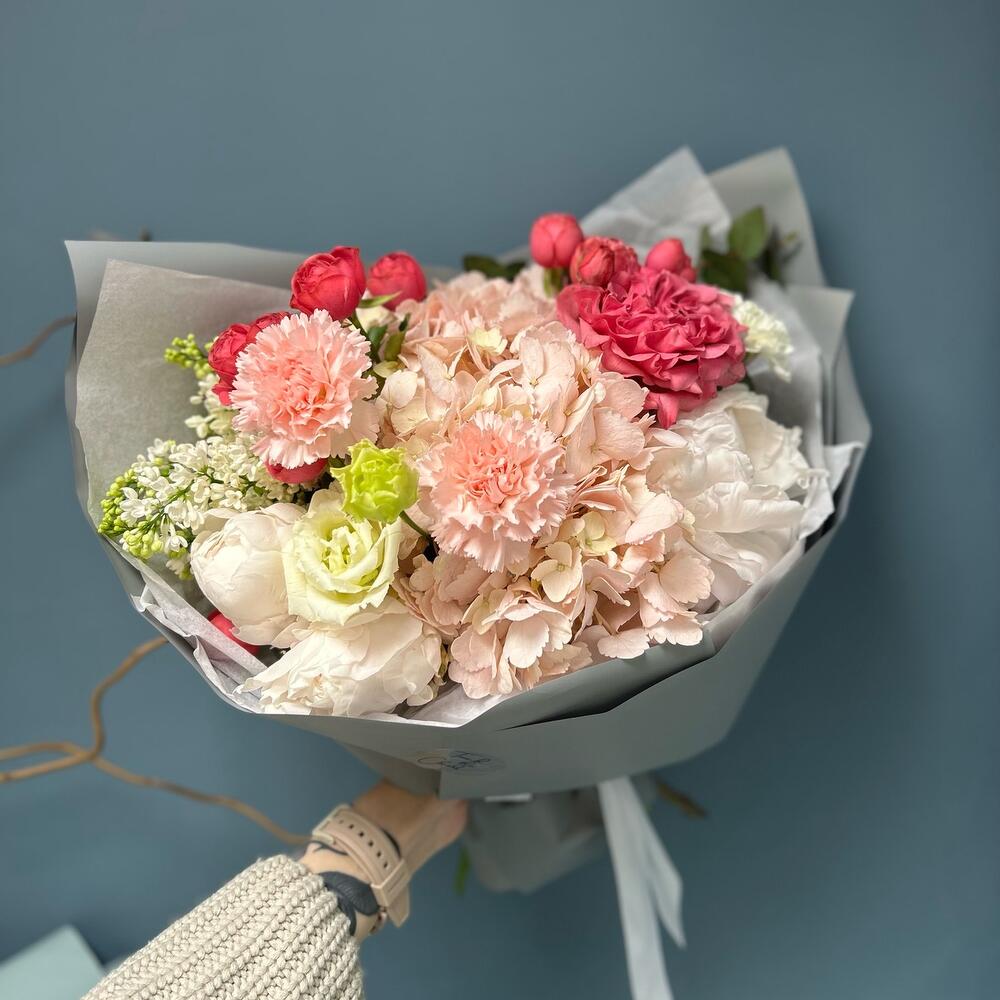 Авторский букет с гортензией, пионами, сиренью и розой