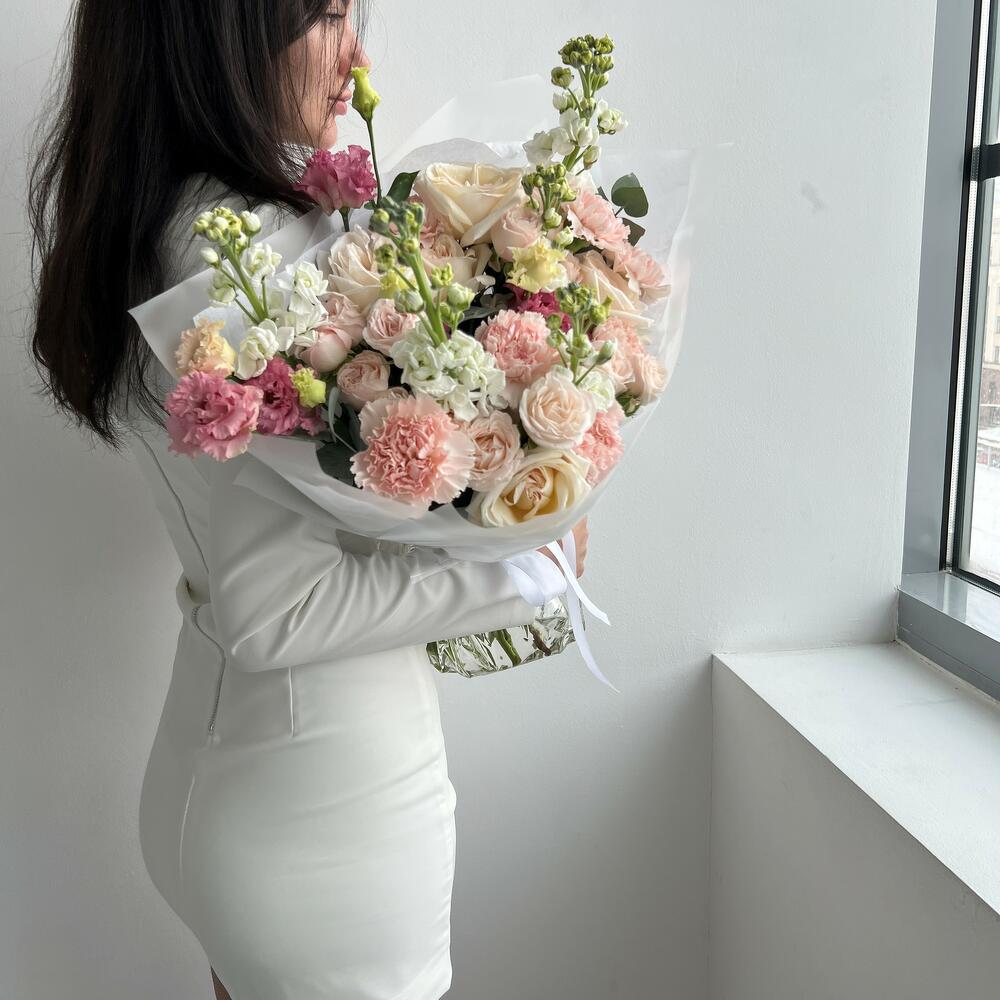 Маттиола – 5 шт.Эвкалипт – 3 шт.Кустовая роза – 4 шт.Гвоздика – 7 шт.Эустома – 3 шт.Садовая роза – 5 шт.