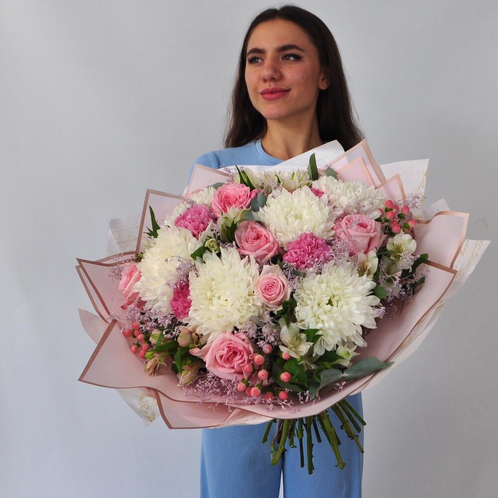 Белые хризантемы и розы в букете «Твоя Нежность»
