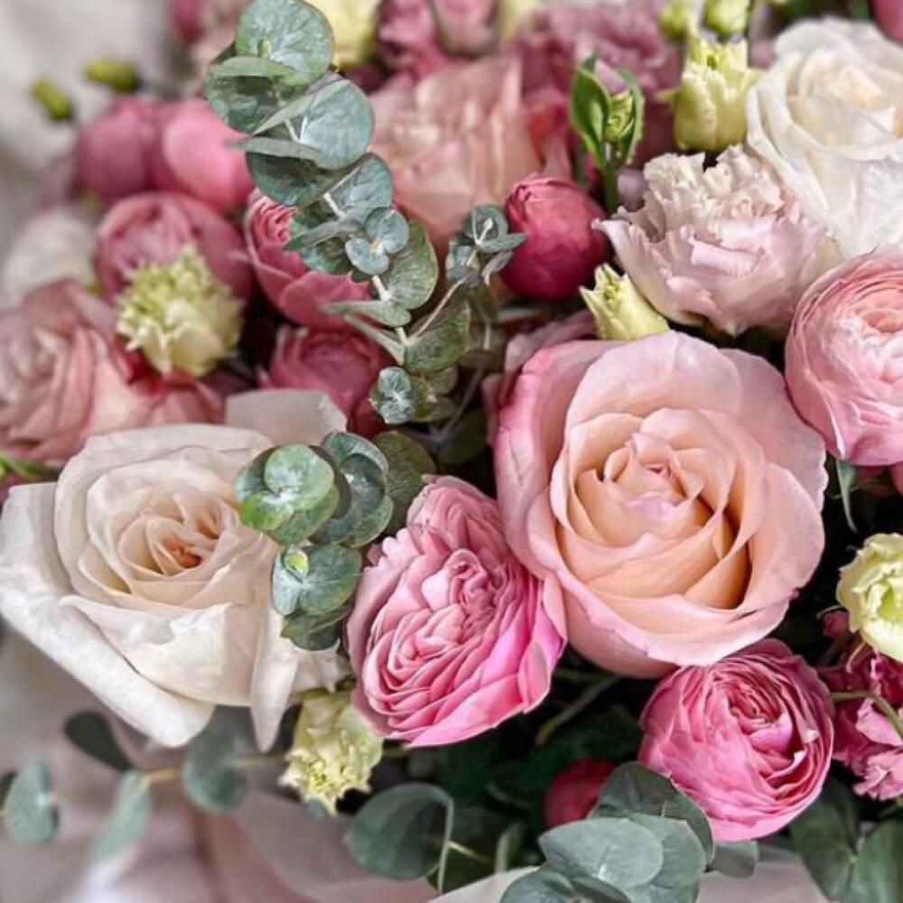 Большая коробка с нежными цветами: розами, лизиантусом и эвкалиптом