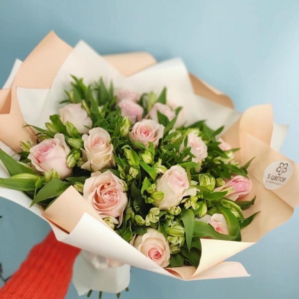 Роза розовая – 15 шт.Альстромерия белая – 20 шт.Упаковка – 1 шт.