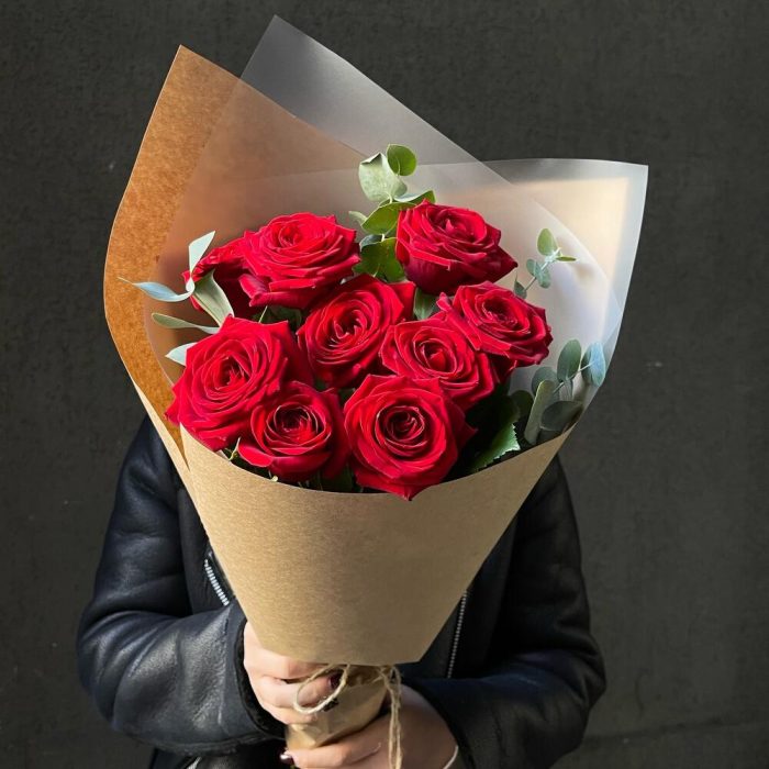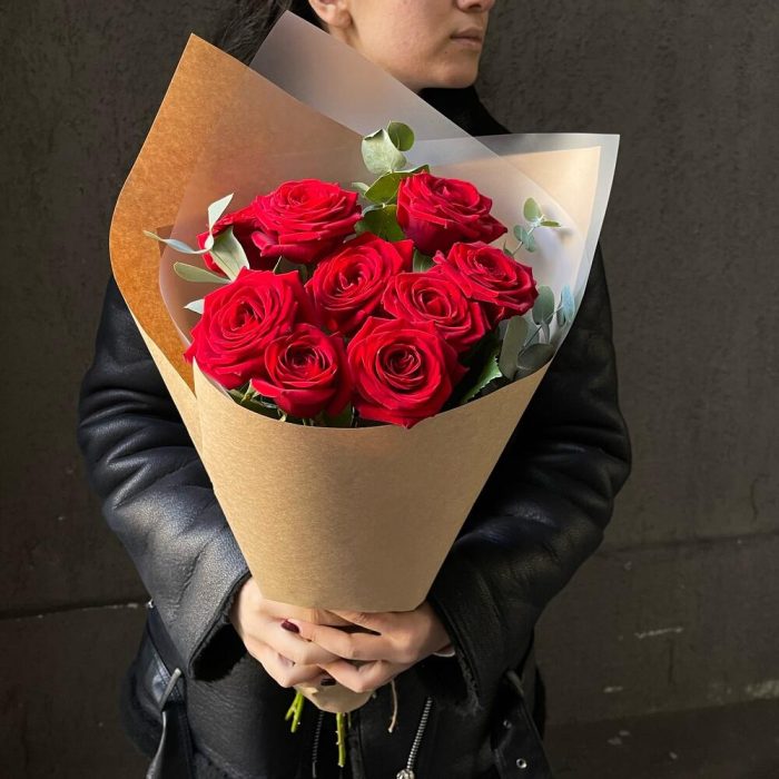 Букет 17: 9 красных роз с эвкалиптом