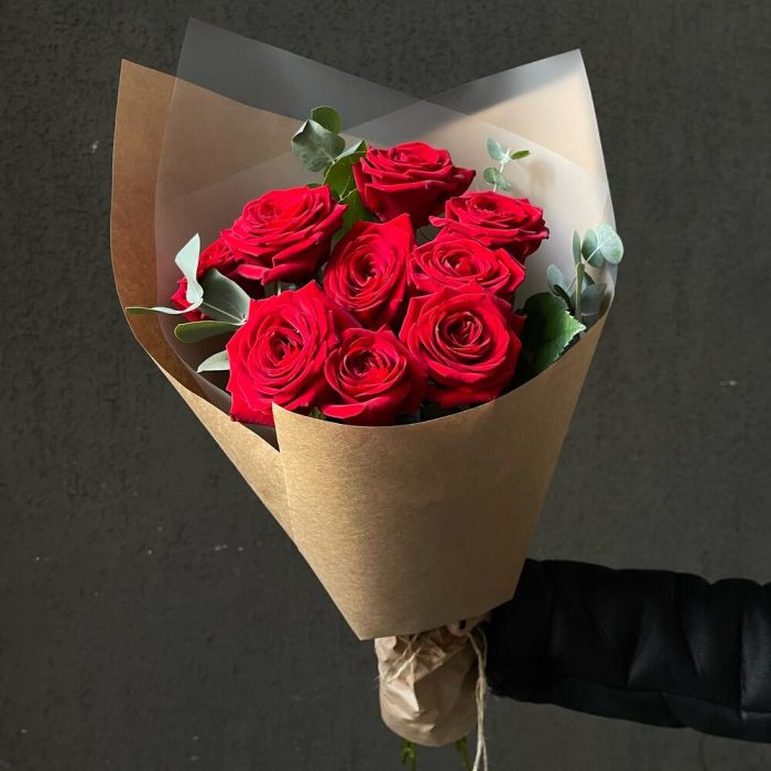 Эвкалипт – 3 шт.Упаковка дизайнерская – 3 шт.Роза красная 50 см – 9 шт.