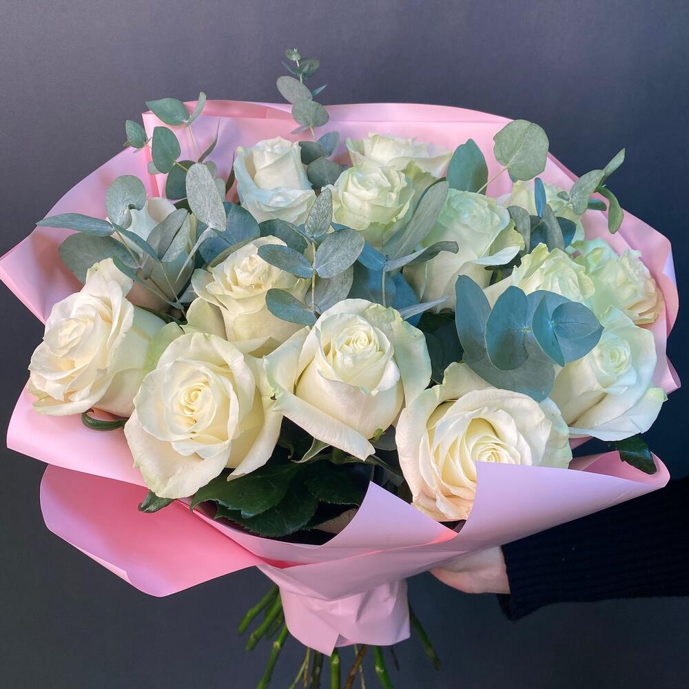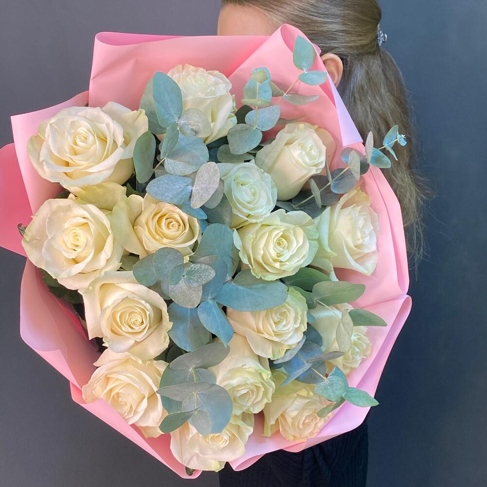 Роза Эквадор – 15 шт.Эвкалипт – 3 шт.Упаковка дизайнерская – 5 шт.Лента атласная – 1 шт.
