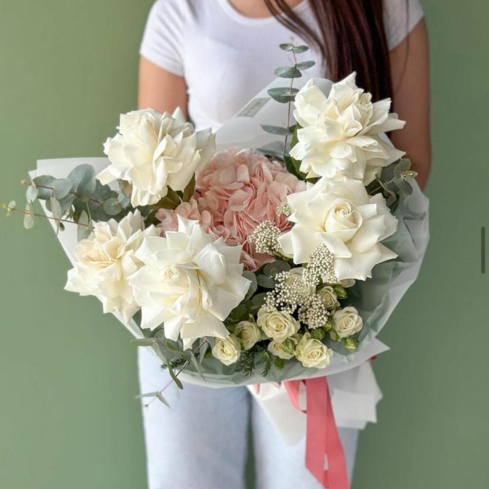 Роза голландская 60 см – 5 шт. Озотамнус – 3 шт. Эвкалипт – 1 шт. Спрей роза – 2 шт. Гортензия – 1 шт.