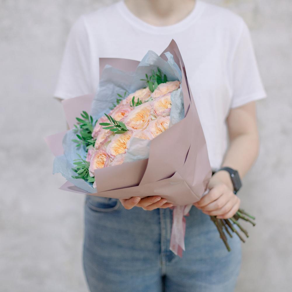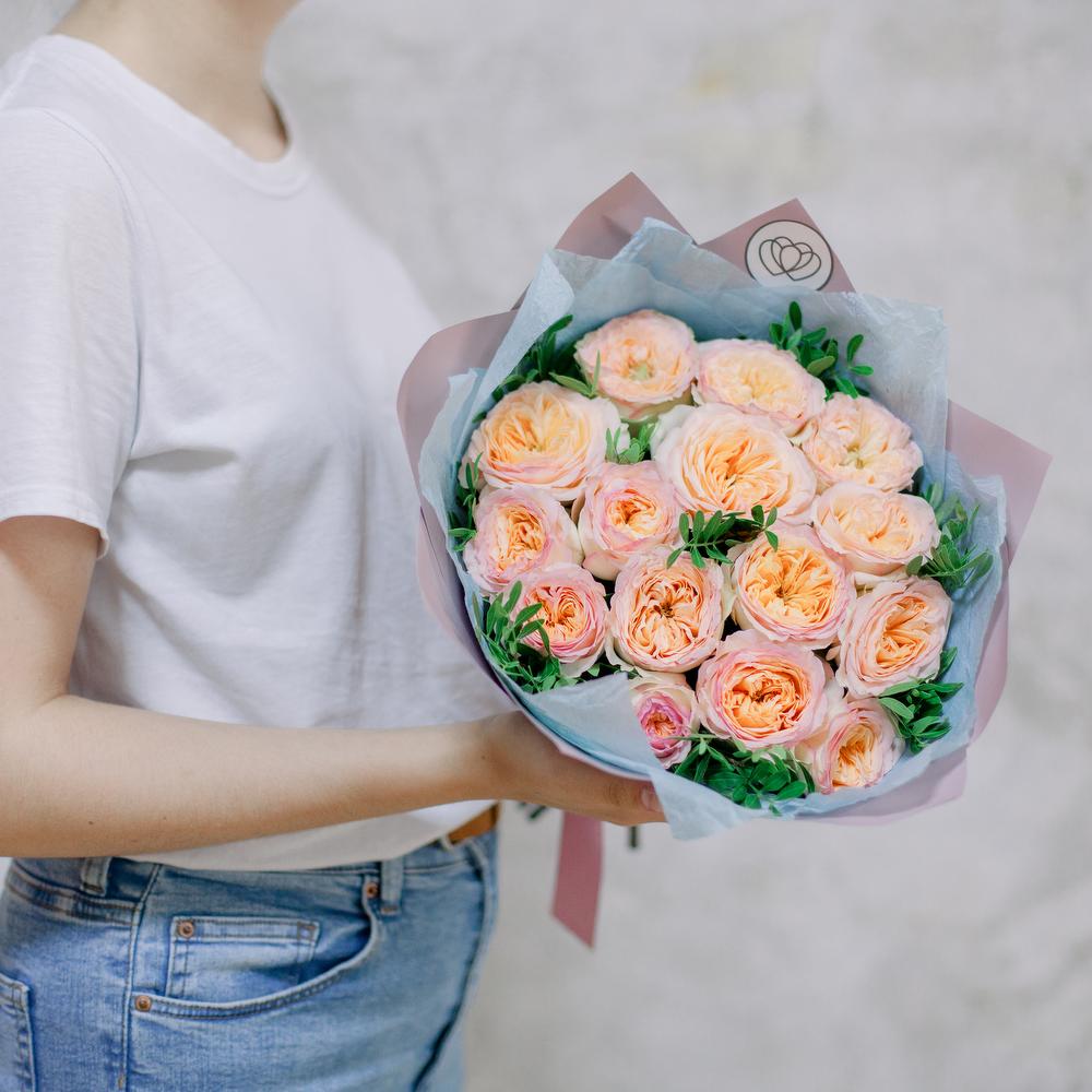 Букет из 15 персиковых пионовидных роз Flash Back с фисташкой
