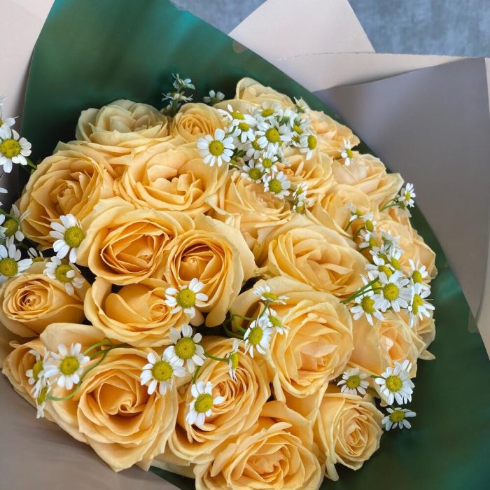 Букет из 25 персиковых роз с матрикарией