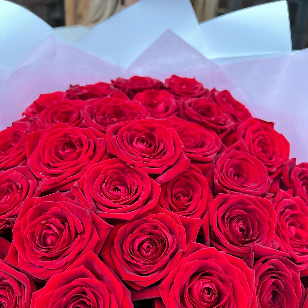 Роза красная 50 см – 35 шт.Тишью – 2 шт.Дизайнерская упаковка – 5 шт.Лента атласная – 2 шт.