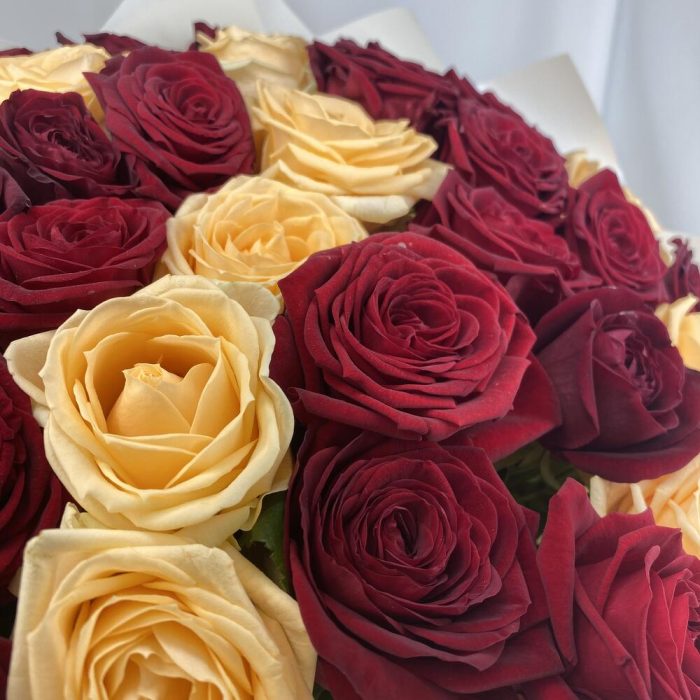 Красная роза – 20 шт.Персиковая Роза – 15 шт.Упаковка – 3 шт.Атласная лента – 1 шт.