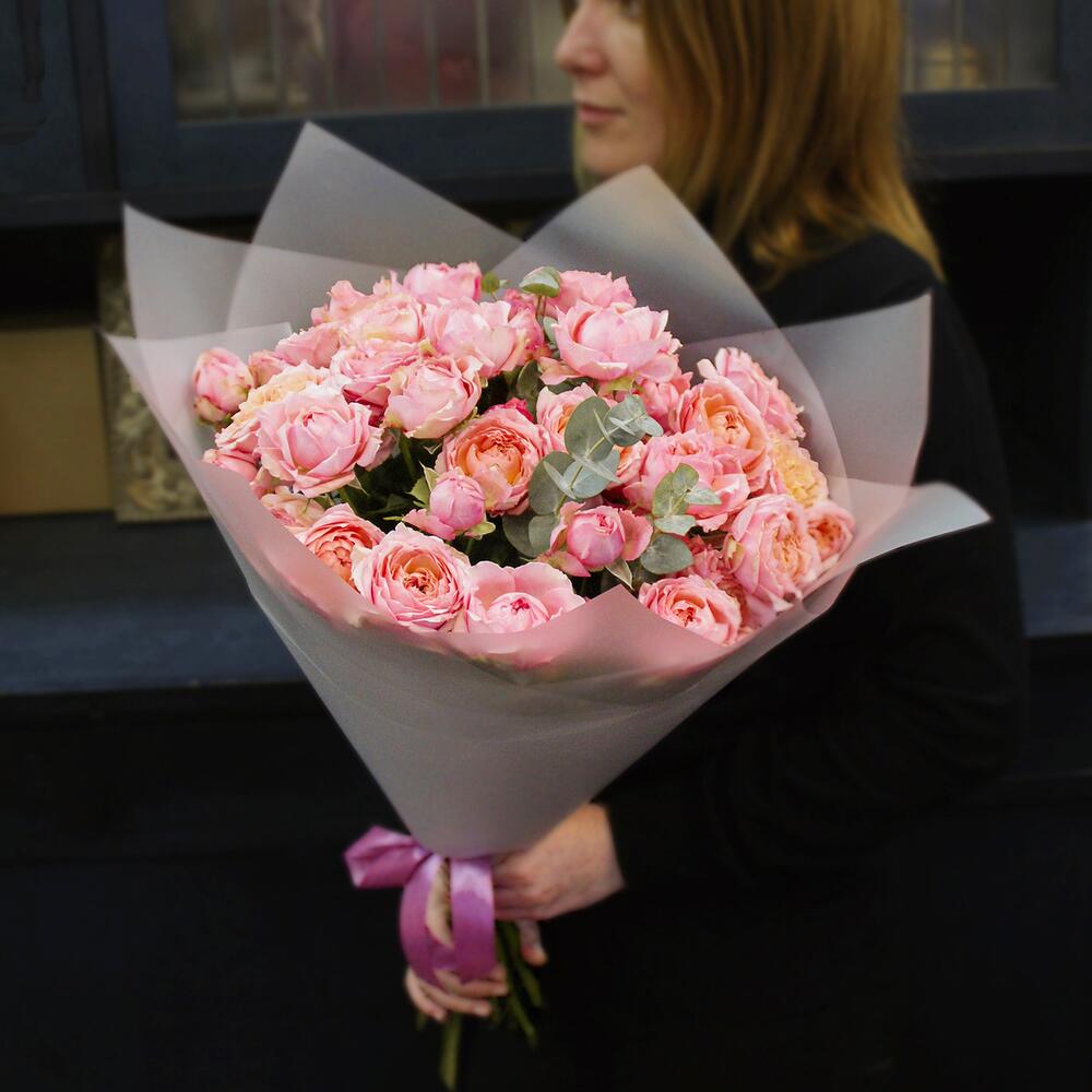Букет из 9 кустовых пионовидных роз Джульетта с эвкалиптом