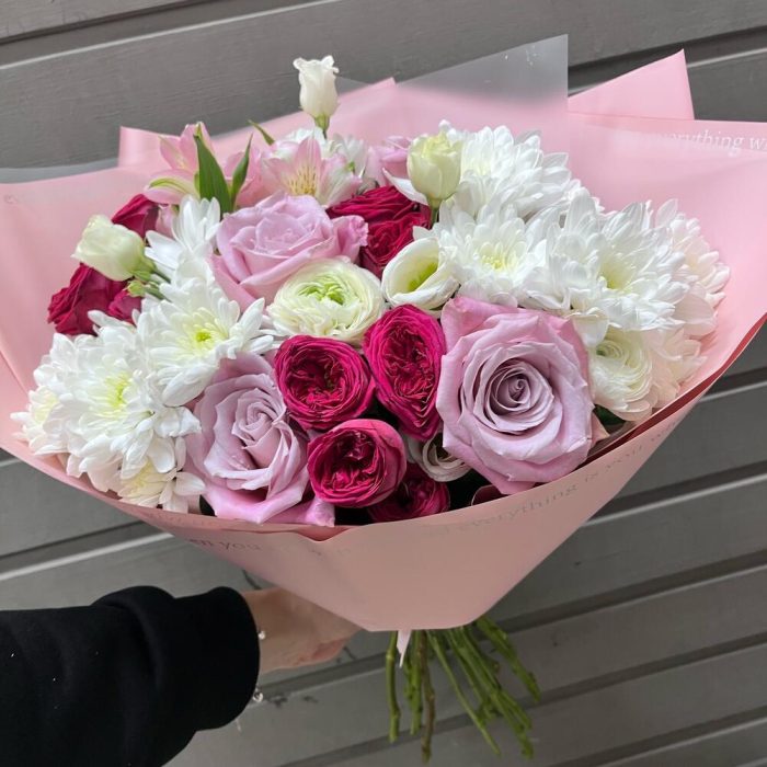 Альстромерия – 1 шт.Хризантема кустовая – 3 шт.Роза – 5 шт.Кустовая роза – 3 шт.Эустома – 2 шт.Оформление – 1 шт.