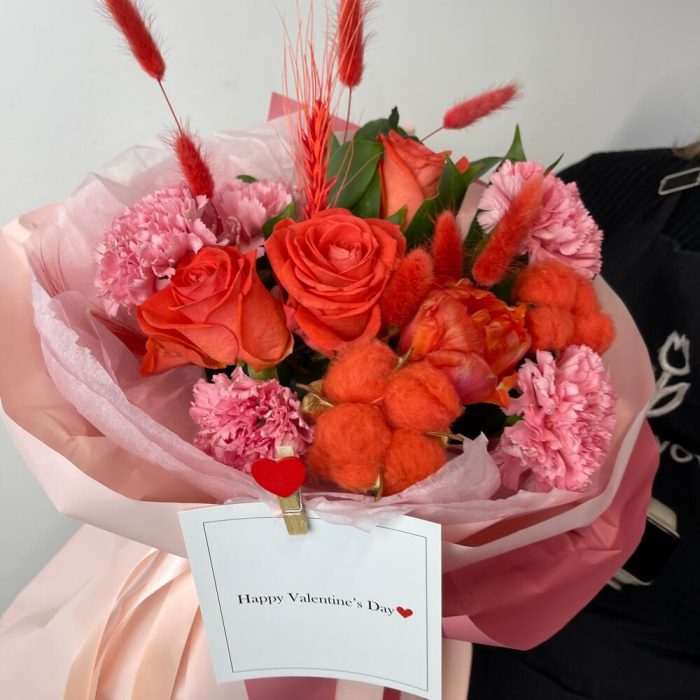 Роза оранжевая – 3 шт.Тюльпан – 2 шт.диантуса – 5 шт.Лагурус (сухоцвет) – 6 шт.Салал – 3 шт.Тишью розовая – 2 шт.Пленка матовая – 4 шт.Открытка – 1 шт.