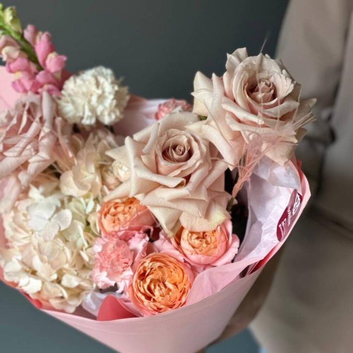 Сборный букет с французскими розами и гвоздикамм в пудровых оттенках