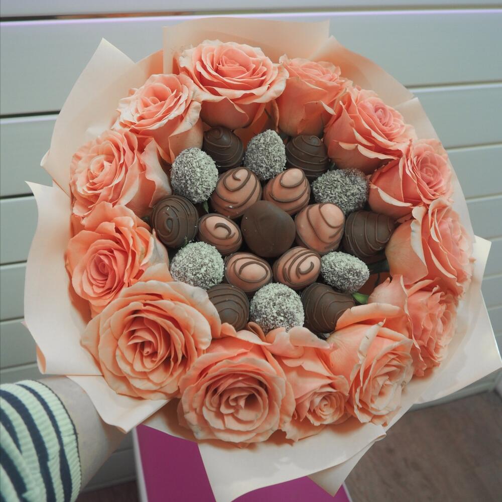 Букет из клубники в шоколаде с розовыми розами