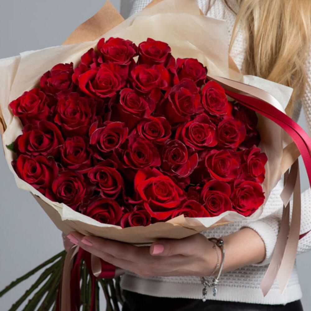 Крафт – 1 шт.Атласная лента – 1 шт.Красная роза 50 см – 35 шт.