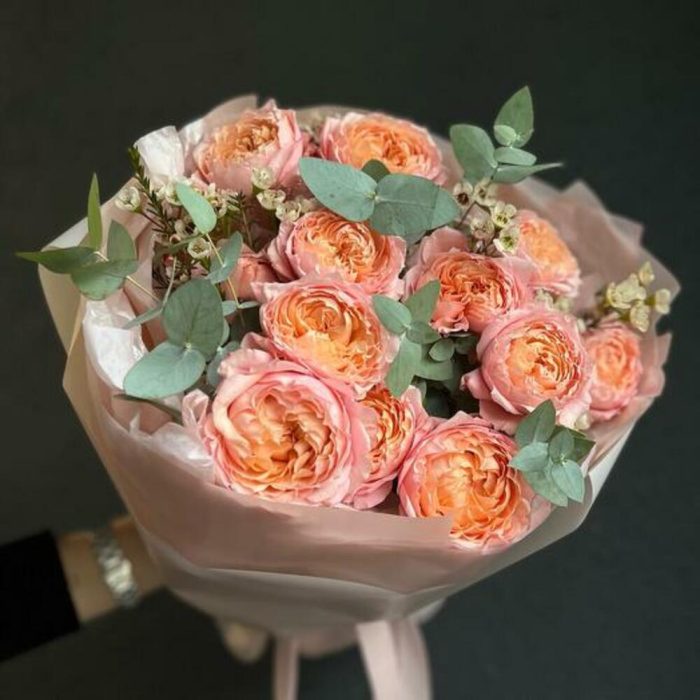 Букет из моно пионовидной кустовой розы Джульетта и эвкалипт