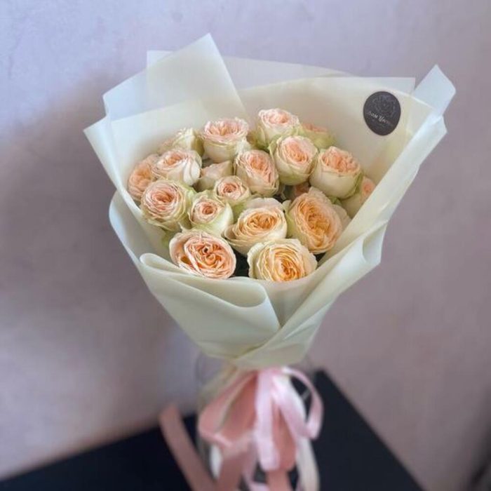 Кустовая пионовидная роза – 5 шт.Дизайнерская упаковка – 1 шт.Атласная лента – 1 шт.