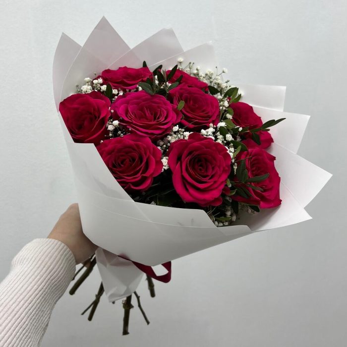 Гипсофила – 2 шт.Роза – 9 шт.Упаковка дизайнерская – 1 шт.