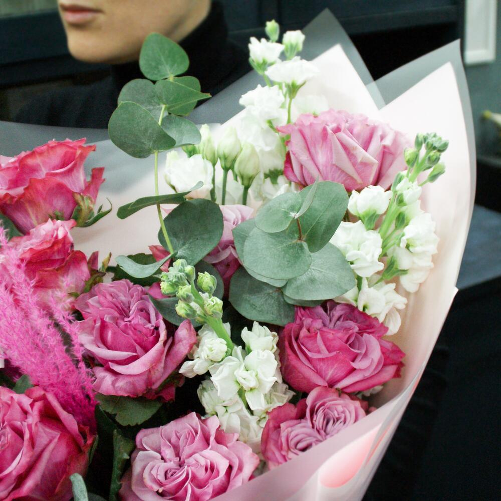 Букет из кустовой пионовидной розы, хамелациум и эвкалипта