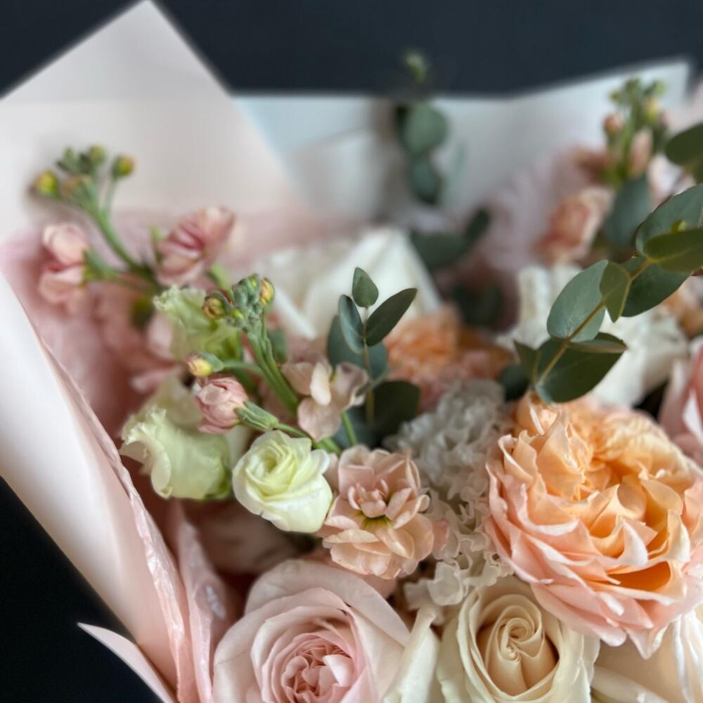 Кустовая пионовидная роза – 1 шт.одноголовая пионовидная роза – 3 шт.Маттиола – 2 шт.Лизиантус – 2 шт.Одноголовая роза – 3 шт.Эвкалипт – 7 шт.декоративная упаковка – 1 шт.Атласная лента – 1 шт.